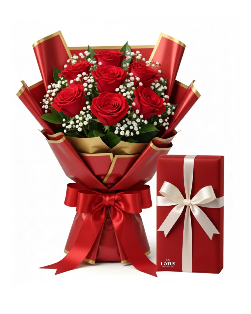 Um buquê de 7 rosas vermelhas intensas, envolto em papel vermelho com acabamento dourado e laço de cetim luxuoso. Acompanha uma caixa de bombons, criando o presente ideal para demonstrar amor, paixão e carinho em qualquer ocasião especial.